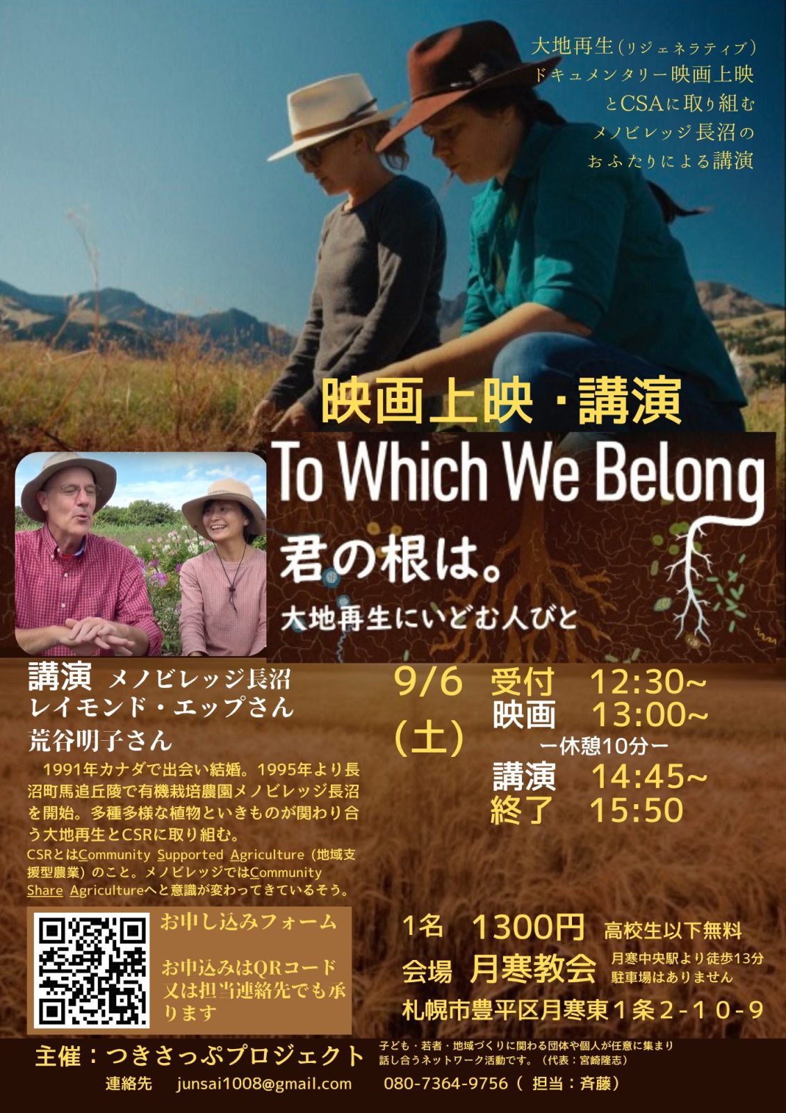 この映画は大地再生のドキュメンタリー映画ですが、単に農に関わる話ではなく分断し続けた人間の生きかたそのものを捉え直すきっかけになる映画です。社会の縦割の仕組みが分断を進め、「個」から「孤」へと進む現代、この映画は’つながり’が土の中の根のように目にはみえないけれど重要であることを示唆してるとも言えます。当日は繋がりづくり(CSA)を実践されているメノビレッジ長沼のおふたりの講演で、有機栽培から転向し地域やご本人達にどんな変化があるのか等もお聞きしたいと思います。